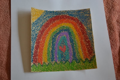 5. However, if you look at your sandpaper, you'll see that the crayon wax has melted onto the grains of sand in the sandpaper, making it look like you glued on lots of different colors of sand. The picture doesn't quite pick it up, but some of the crayons were sparkly, so it had the effect of glitter in the finished piece.
